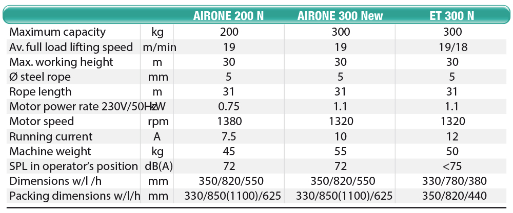 The special machine configuration makes it easy to install thanks to better weight distribution for the operator. The raised loading point simplifies the passing of materials through windows. Airone 200 N and Airone 300 New have an extensible arm up to 1100 mm. Maximum capacity remains unchanged for the entire extension so bulky material can be lifted without the risk of striking the structures.