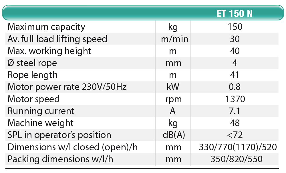 High lifting speed (30 m/min). Ideal for construction sites up to 40 m high. Maximum capacity 150 kg