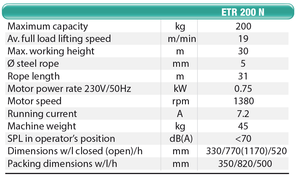ETR 200 N lets you work with a bracket from 720 mm up to 1120 mm. Maximum capacity remains unchanged for the entire arm extension so bulky materials can be lifted without the risk of striking against the structures. The low noise level allows working without causing noise harmful to the operator’s health and bothersome to others.