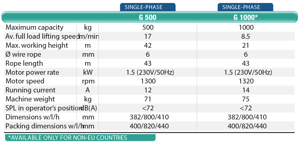 Stand hoist. Single-phase 230V/50Hz electric motor. Average full load lifting speed: 8.5 m/min. Max. capacity 1000 kg. Available only for non-EU countries.
