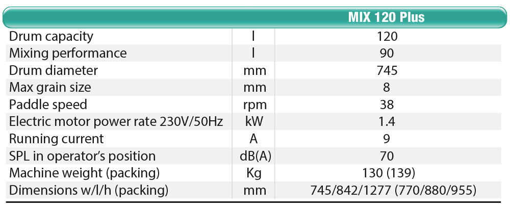 Compact mortar mixer. It batches the most difficult products, both traditional and pre-mixed materials. Drum capacity 120 l.