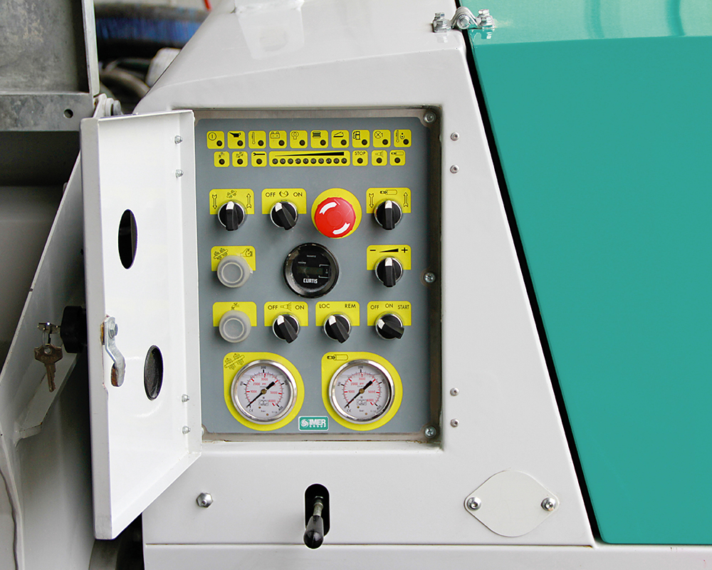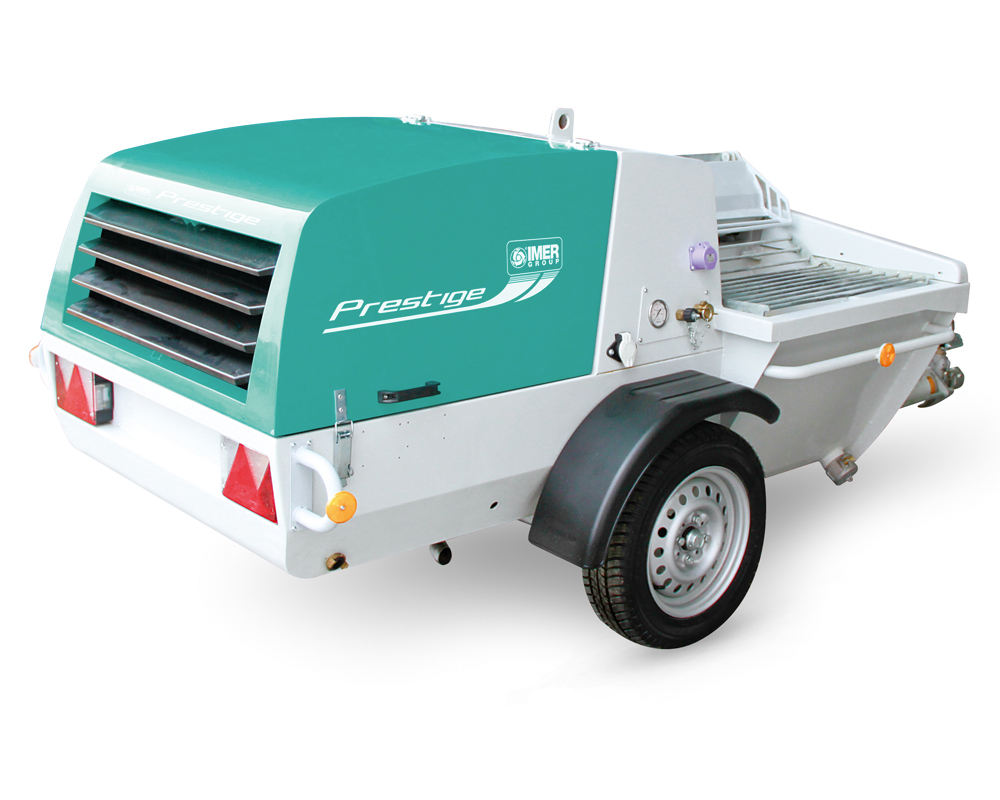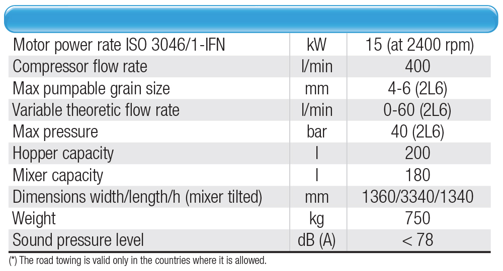 Plaster sprayer with Diesel engine for dry premixed materials. ECO TPOWER system adjusting revolution number according to working phase. Mixer capacity: 180 l
