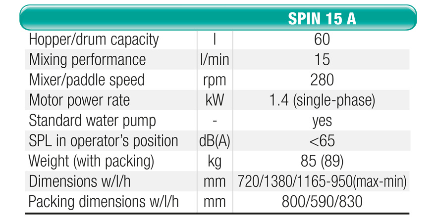 Ideal for quickly mixing premixed plasters, masonry mortars, selflevelling materials and traditional pre-mixed materials in bags. If provided with special optional kit, it is particularly suitable for mixing fine mortar for laying external insulation and tiles. In combination with a plaster sprayer, it can form a single mixing and pumping unit.