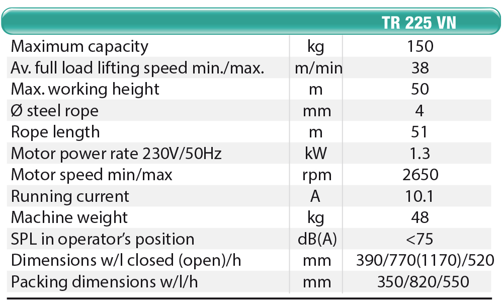 The low noise level allows working without causing noise harmful to the operator’s health and bothersome to others. TR 225 VN has a high lifting speed (38 m/min) that allows to rapidly work on construction sites with great heights. Ideal for construction sites up to 50 m high.