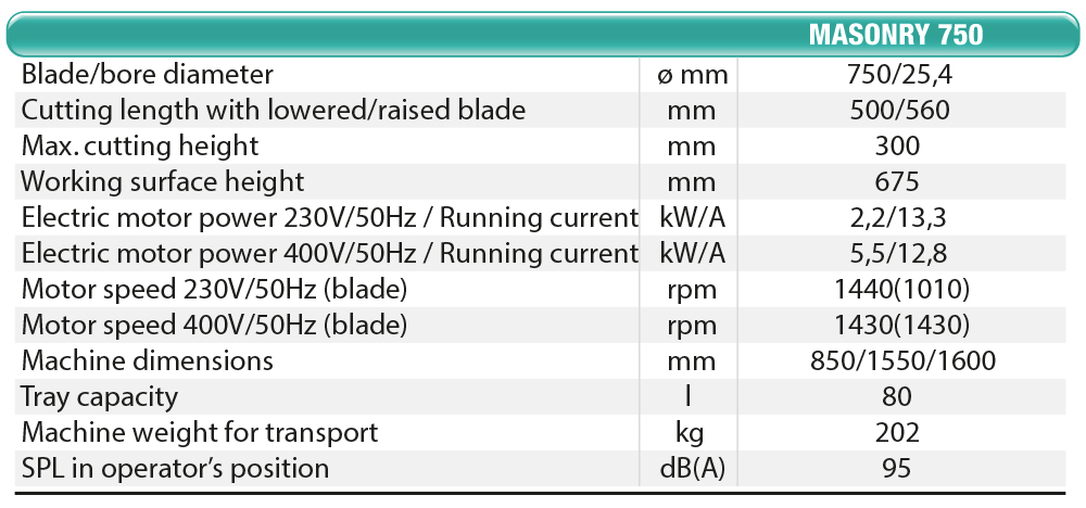 For cutting large materials like structural stone blocks, cement blocks and stone facing. The sturdy structure of the Masonry 750 and the powerful motor ensure excellent efficiency. The single-phase version is a particularly efficient and versatile machine, for working also in places where there is no 400V/50Hz power supply.